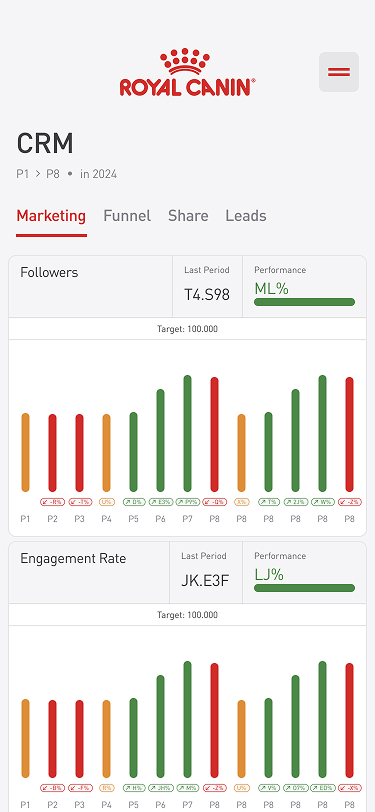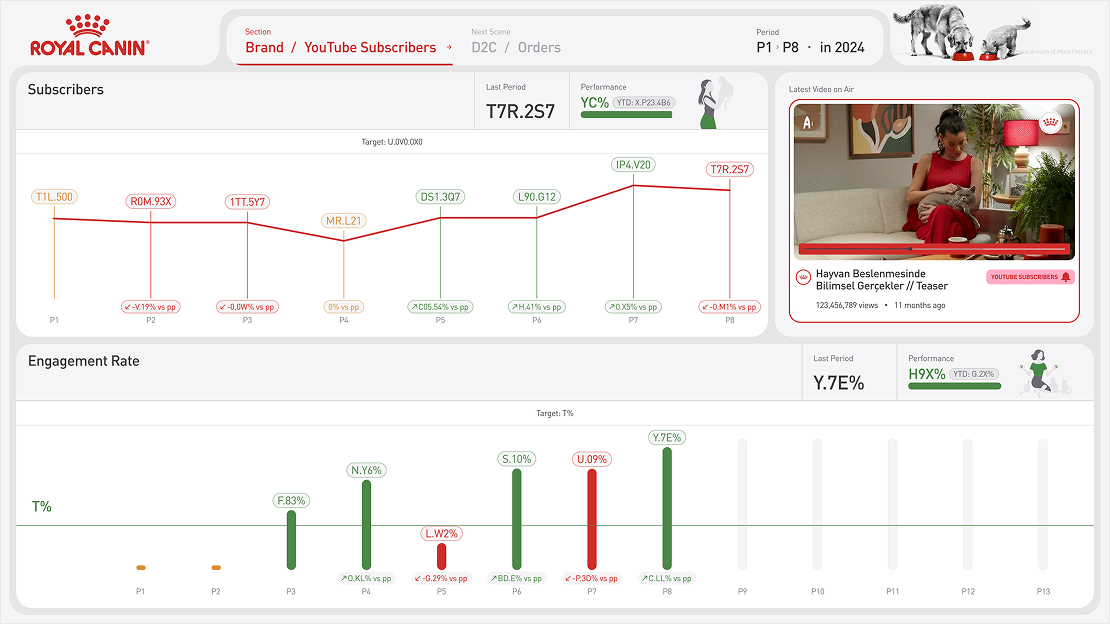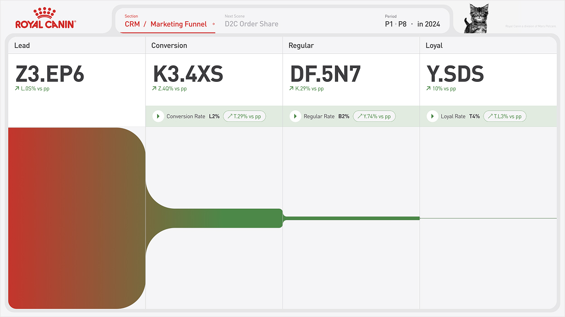 For Royal Canin, we designed a two-phase dashboard system to support data-driven decision-making across internal teams. Built for large-scale office displays and marketing use cases, the solution improved visibility, alignment, and operational efficiency through real-time data and clear visual structures.